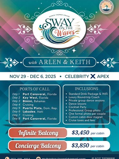 Great price on a great dance cruise. Sail with Arlen & Keith, plus John and Sherry Linderman for 7 nights of fun private dance socials and 9 included group lessons. This is an all inclusive cruise (except for gratuities), that includes round trip transportation to the port. Contact Arlen for information and complete brochure.